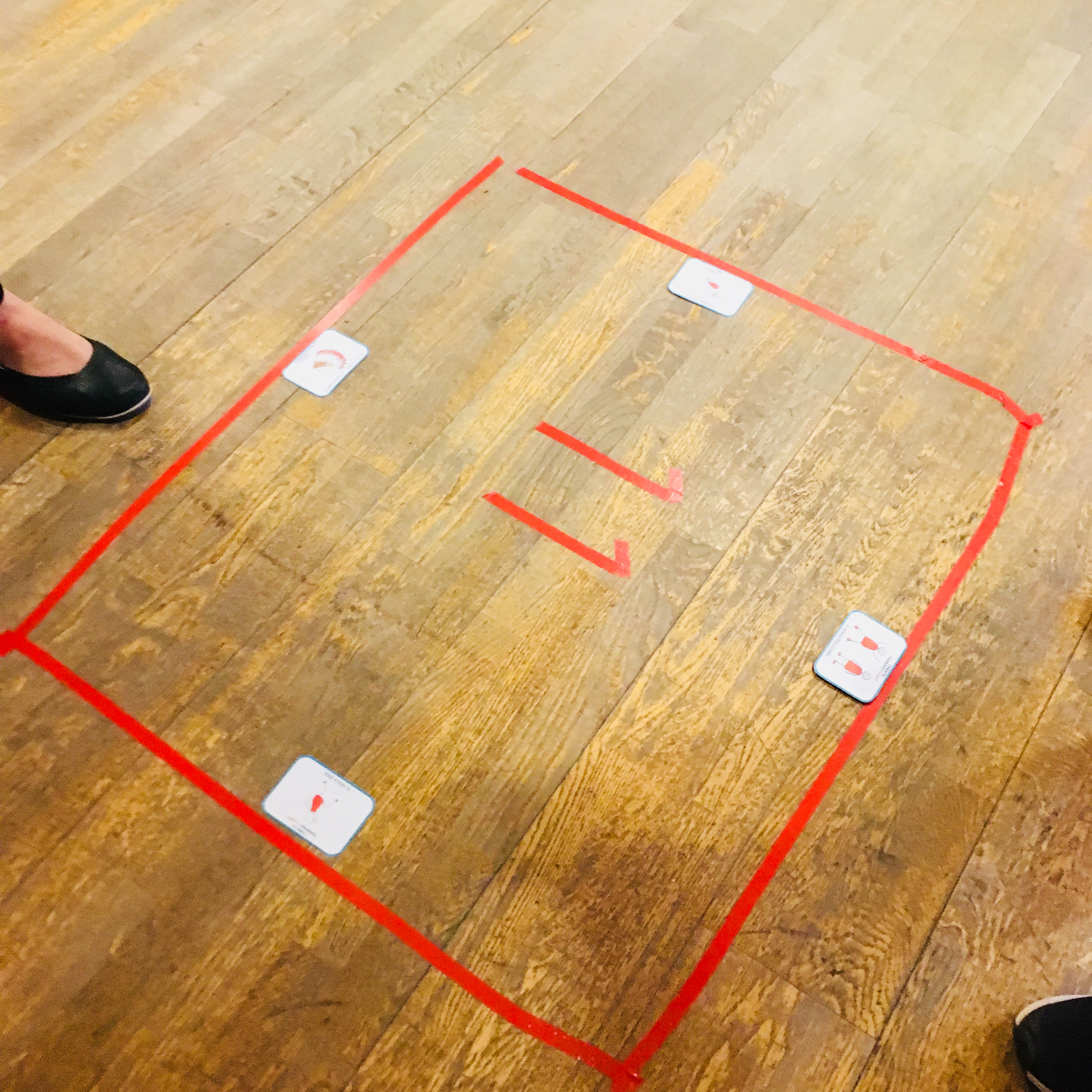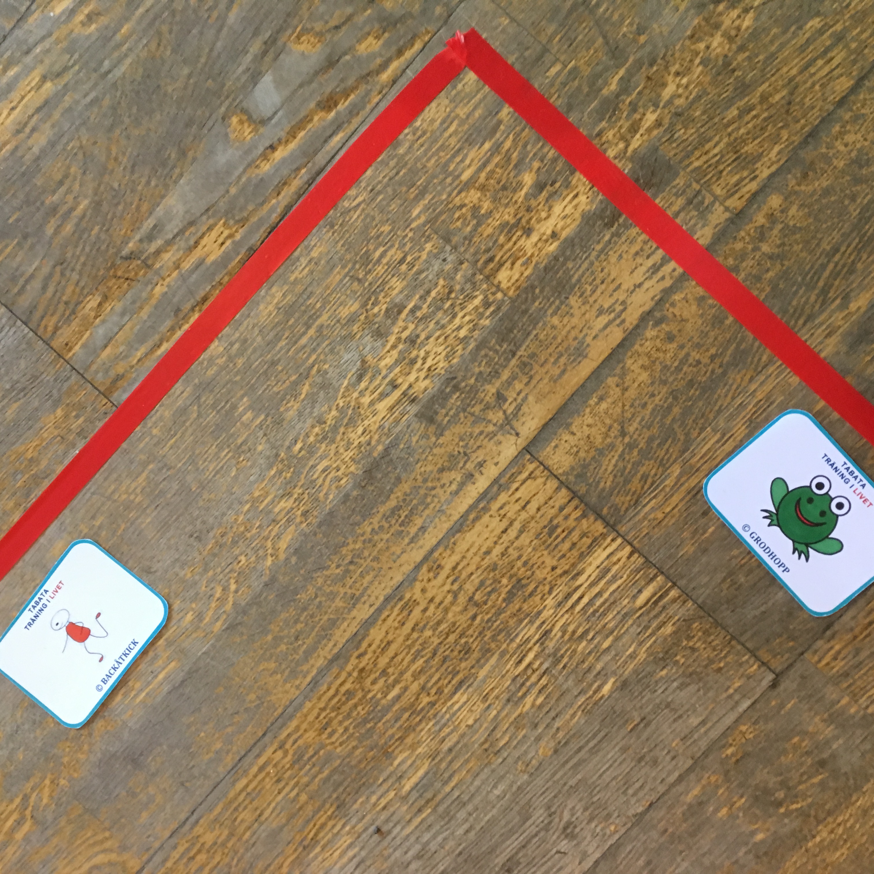 Tejpa en ruta. Vi placerade en siffra i mitten. Siffran talar om hur många gånger vi ska upprepa varje rörelse innan vi går vidare till nästa övning. Placera kort med övningar vid kvadratens fyra sidor. Exempel på kort att trycka ut finner ni nedan. Vi har använt våra kort från Tabata och Träna till 100. Vill ni, kan ni köpa här. Barnet vänder sig mot en sidan av kvadraten och utför lika många av upprepningar av rörelsen som kortet visar. Utan att pausa vänder sig barnet mot nästa sida och utför lika många upprepningar av rörelsen som kortet visar osv. Kör gärna flera varv. Det blir pulsträning.