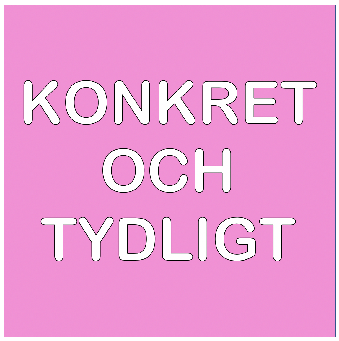 Genom en serie som vi kallar Konkret och Tydligt ska vi under de närmaste månaderna försöka bena upp vissa saker. Vårt mål är att det ska vara enkelt att införa mer rörelse och fysisk aktivitet i förskolan och skolan men även i hemmet. Att vara konkret och tydlig kan skapa goda strukturer, så låt oss försöka tillsammans.